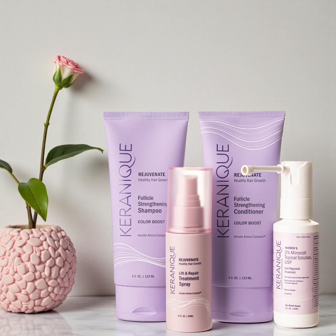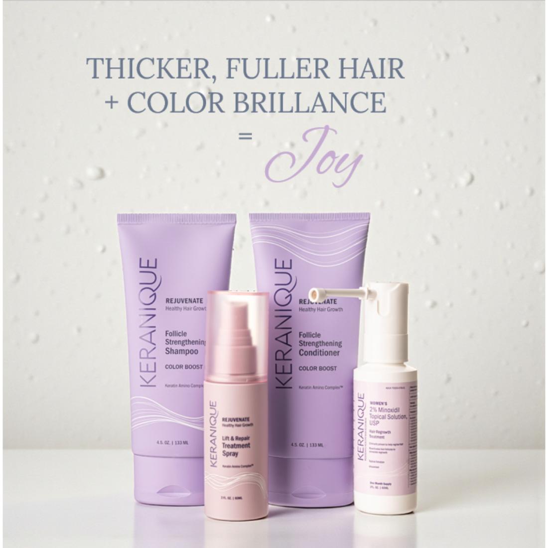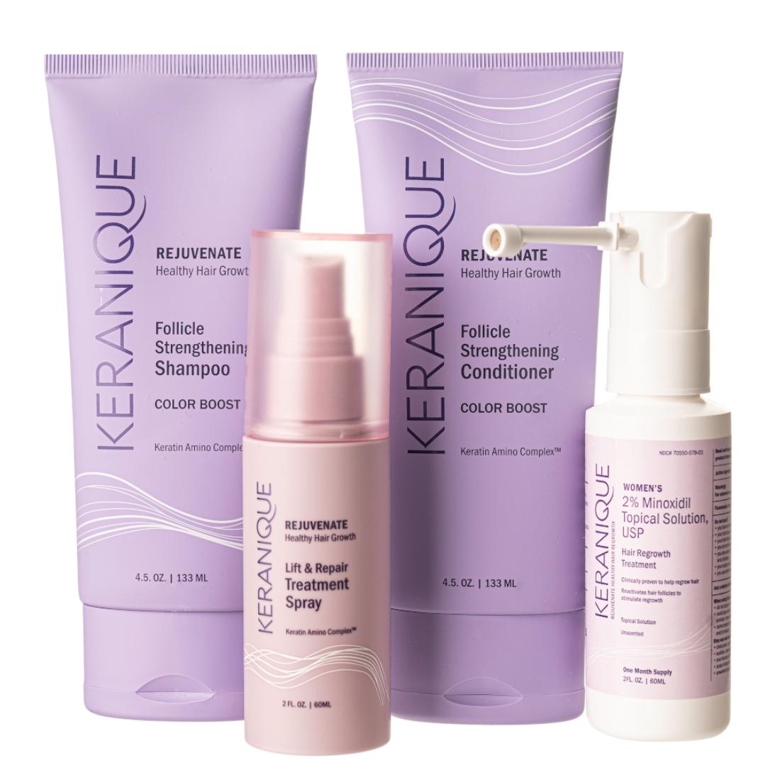 Keranique's Color Boost Complete Hair Regrowth System is a 4-piece kit that combines the science of a clinically proven hair regrowth treatment with premium hair care. Developed for color-treated hair and enriched with strand-saving Keratin Amino Complex. Reduces color fade up to 20 washes!