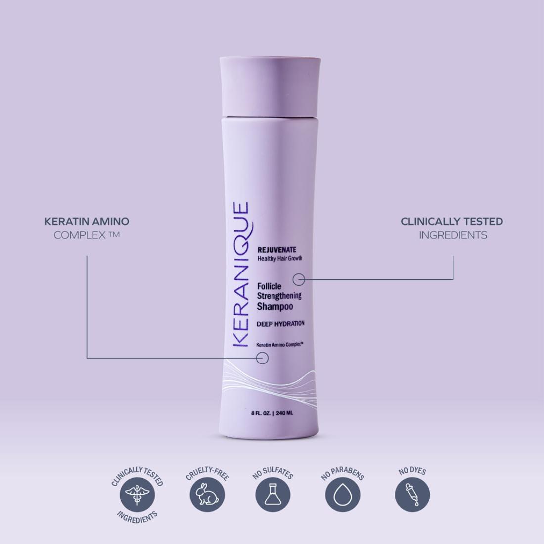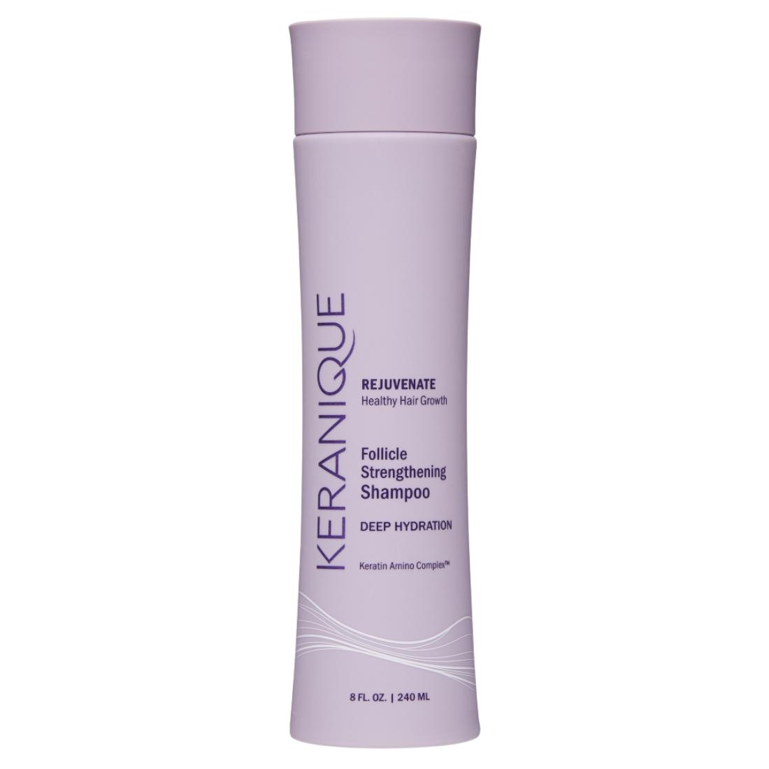 Keranique® Follicle Strengthening Shampoo - Deep Hydration is a mild, soothing shampoo featuring moisturizing ingredients and our Keratin Amino Complex® to envelope the hair shaft with a cushion-like coating of amino acids and proteins that condition and protects dry, damaged hair. Infused with the Keranique® Keratin Amino Complex®, which includes a blend of botanicals, amino acids, and proteins, to leave your hair stronger, and looking healthier.